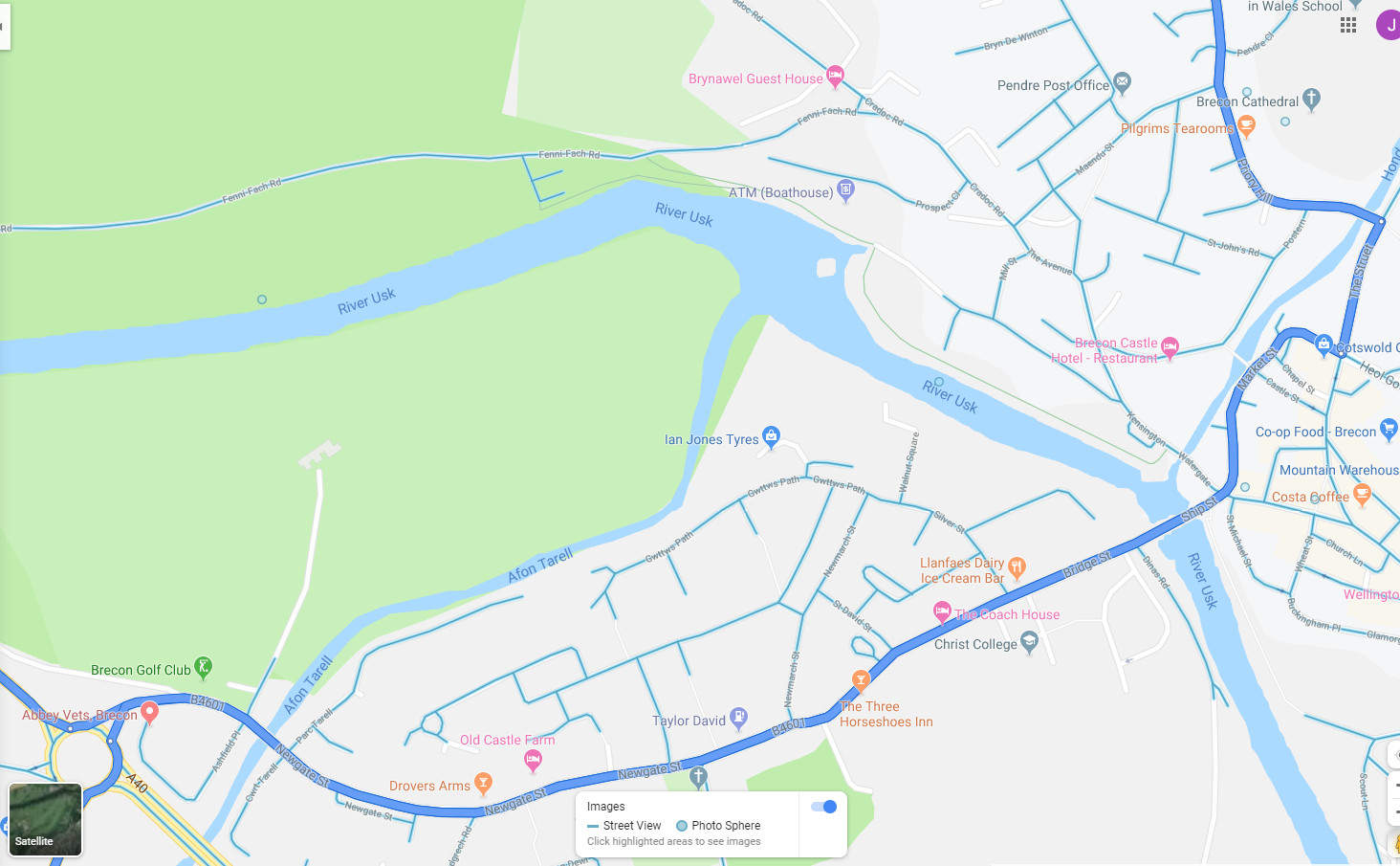 Initial reverse of outbound route towards Brecon along the B4520 and B4067 but with a small change at the Brecon end - see below.