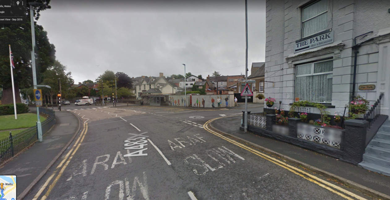 The south bound right turn, back towards Upper Chapel and Brecon, is shown below. Follow signs to Brecon and onto the B4520, Brecon Road.