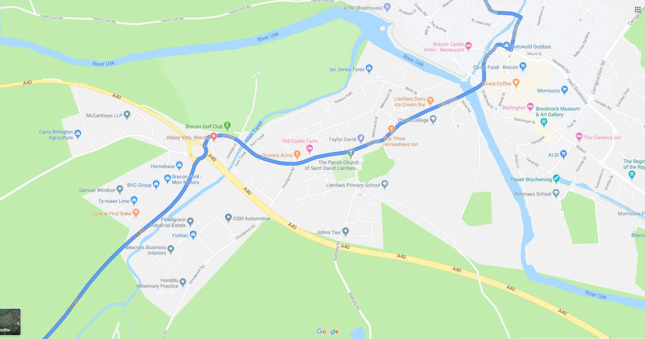 Running into Sennybridge there will be a sharp left and then a junction. Turn right onto the A40 towards Brecon.